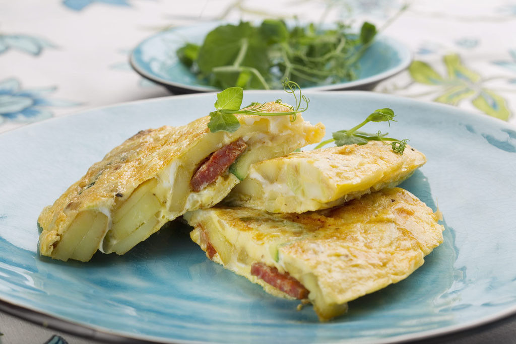 - Vatkaa tilavassa kulhossa rikki munat ja mausta suolalla ja pippurilla. Kääntele joukkoon perunat ja sipulit. Kuumenna öljytty pannu ja kaada seos sille. Kypsennä miedolla lämmöllä, kunnes seos alkaa hyytyä. Laita pannun päälle iso lautanen, kumoa tortilla sille ja liu'uta takaisin pannulle. Paista vielä muutama minuutti, anna jäähtyä ja leikkaa siivuiksi.