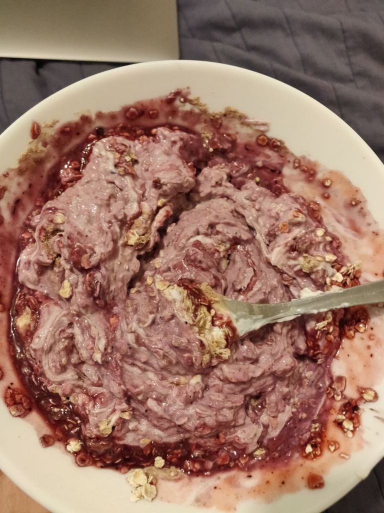 Kun kaikki aineet ovat ovat lautasella, sekoitetaan lusikalla ainekset sekaisin, sen jälkeen ei muutakuin herkuttelemaan!