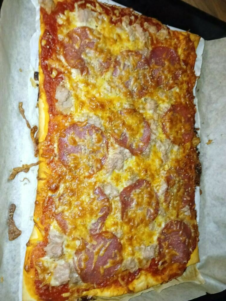 Aseta pohja pöydälle. Levitä tompskumurska siihen, tasaisesti. Lisää tonnikala (calvo, kallis). Lisää metukka. Tasaisesti molemmat. Sitten juusto piälle ja uunia kohti :) anna olla niin kauan että pinta ruskistuu. Ota pois uunista. Älä polta näppejä!!!! Nauti oluen kera.