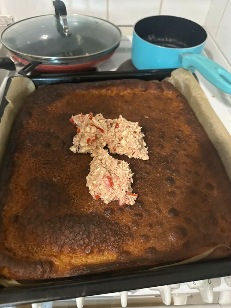 Täyte: sotke yhteen tonnarit, silputut tomaatit, persilja tai sitä yrttiä mitä sulla on jos sulla on ja feta ja majoneesiä joku puol purkkia.