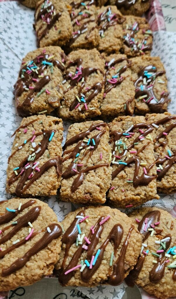 Keksit ovat rapeita, mutta seuraavana päivänä muuttuu vähän sitkeäksi mikä johtuu hedelmistä.