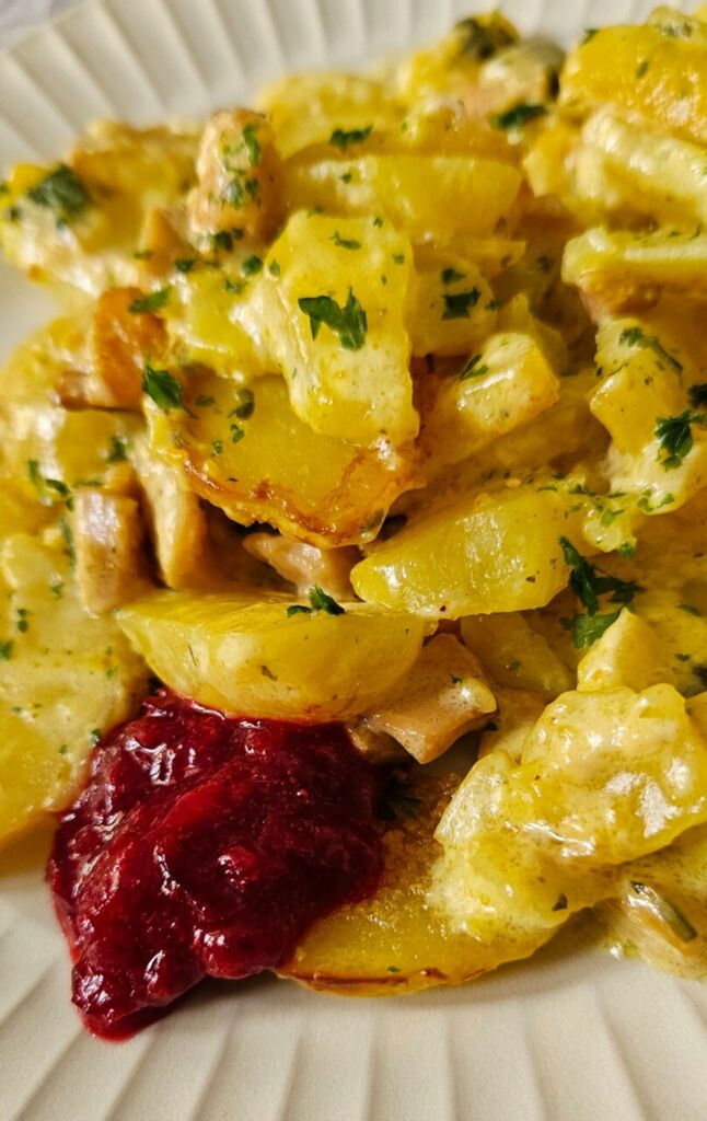 Sekoita kulhossa kerma ja sinappi sekä vähän sekamaustetta. Kaada perunoiden päälle vuokaan. Ripottele korppujauhoja ja laita myös muutama voinokare. Peitä foliolla vuoka. Loppu vaiheessa ota folio pois ja anna väriä vuoan pintaan.